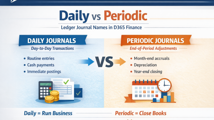 While working with ledger transactions in the General Journal in Microsoft Dynamics 365 Finance, two types of Ledger Journal Names are most commonly used: Daily and Periodic. Other journal names exist, but they are usually specific to certain business scenarios.