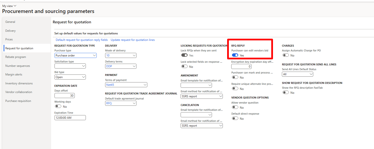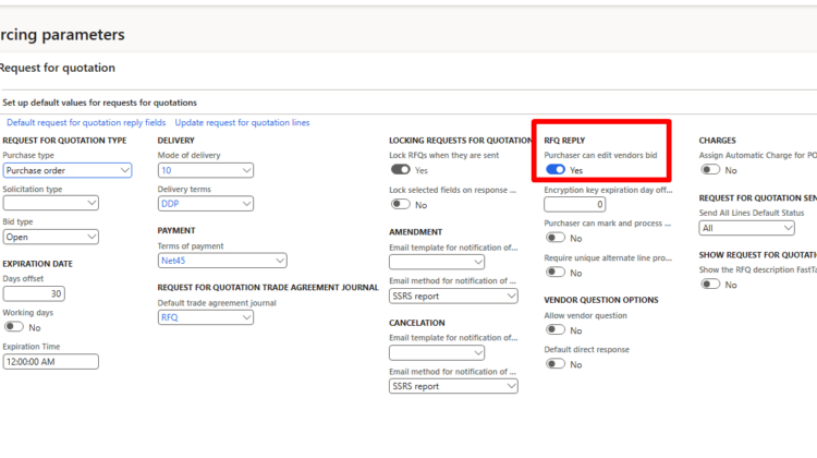 In Dynamics 365 Procurement and Sourcing, RFQ behavior is controlled by system parameters. In Demo data, one critical parameter is disabled by default, which blocks RFQ replies.